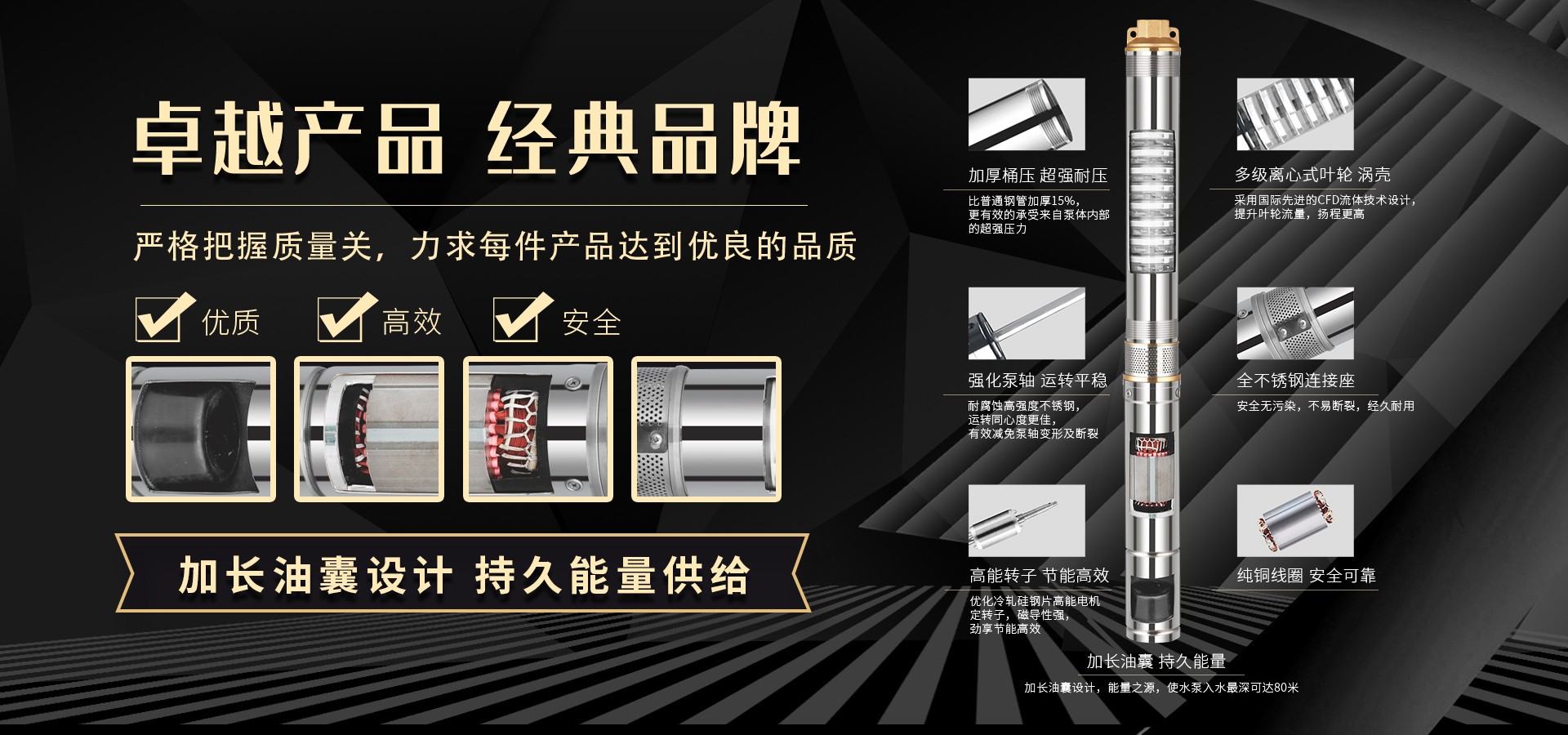 不僅僅是泵,更是流動的科技。十多年來,本公司堅持走:以質(zhì)量求生存以科技創(chuàng)新求發(fā)展,重合同守信用的道路,生產(chǎn)經(jīng)營得到迅速發(fā)展。更希望以后不管從發(fā)達(dá)城市到新農(nóng)村,從工業(yè)制造到尖端科技產(chǎn)業(yè)都隨處可見創(chuàng)江井泵的身影,創(chuàng)江深井泵已成為干萬用戶心目中優(yōu)質(zhì)和信心的保證我們將以優(yōu)質(zhì)的產(chǎn)品和最完善的售后服務(wù)來真誠與各界朋友開展廣泛的合作,共同創(chuàng)造一個美好的未來!